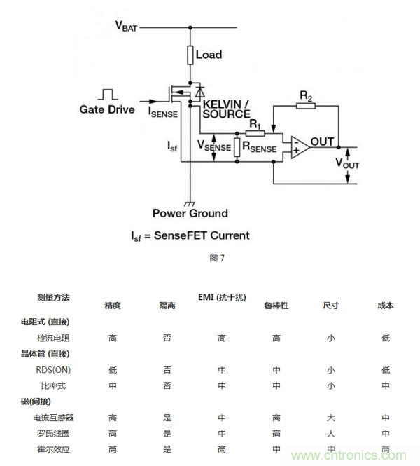 MOSFET由成千上萬個能降低導通電阻的并聯(lián)的晶體管元胞構(gòu)成。檢流MOSFET使用一少部分并聯(lián)元胞,連到共柵極和漏極,但源極是分開的(圖7)。這樣就產(chǎn)生了第2個隔離的晶體管,即“檢測”晶體管。當晶體管導通時,流經(jīng)檢測晶體管的電流與流經(jīng)其他元胞的主電流成一定比例。