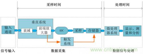 數(shù)字示波器捕獲信號的過程是典型的“采集-處理-采集-處理”過程,如圖1所示為數(shù)字示波器的采集原理,一個(gè)捕獲周期由采樣時(shí)間和(處理時(shí)間)死區(qū)時(shí)間組成,如圖2所示。