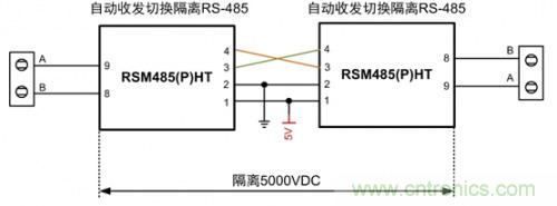 RS485的應(yīng)用中,有時需對信號進(jìn)行增強,或不同的RS485網(wǎng)絡(luò)之間進(jìn)行電氣隔離,輸入和輸出都是RS485信號,此時需用到RS485的中繼器。而基于RSM485系列,可快速搭建簡易的隔離型RS485中繼器,如圖2 和圖3所示。
