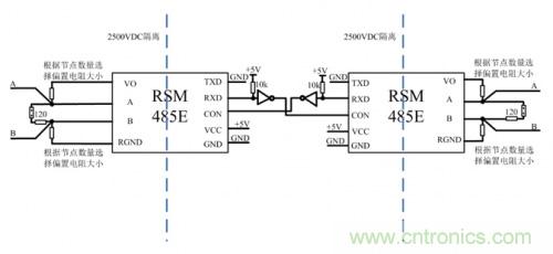 方案一用的是內(nèi)部支持自收發(fā)的RSM485PHT系列,UART端交叉連接即可。方案二用的是常規(guī)帶收發(fā)控制引腳的隔離485,需多用非門電路對收發(fā)進(jìn)行控制。