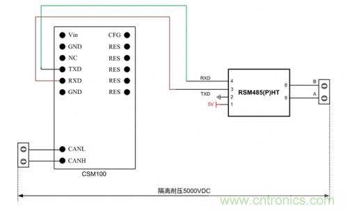 RS485和CAN雖然物理層都是差分傳輸,但因CAN多了更多的底層協(xié)議,兩者不能通過簡單的方式直接轉(zhuǎn)換。此時,使用如圖6所示的CSM100+RSM485模塊方式,利用CSM100能將CAN轉(zhuǎn)成UART數(shù)據(jù),再用RSM485PHT將UART轉(zhuǎn)成RS485電平,實現(xiàn)RS485轉(zhuǎn)CAN的功能。