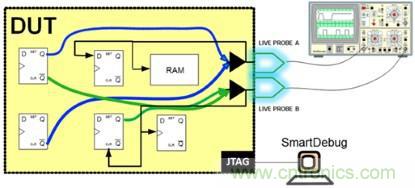 -現(xiàn)場探頭:允許采用兩個專用探頭,經配置用于觀察邏輯元件中任何輸入或輸出的探測點(圖1)。然后,探頭數(shù)據(jù)可發(fā)送到示波器或甚至重新引導回到FPGA結構,驅動內部邏輯分析儀。這些探測點是實時動態(tài)的。探測點可以通過軟件在運行中更改,不需要把FPGA重新編譯或重新編程。
