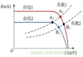最大功率點(diǎn)A1→最大功率點(diǎn)B1(條件:將系統(tǒng)負(fù)載特性由負(fù)載1改為負(fù)載2)