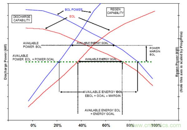 同時電池企業(yè)用以評估電池壽命終結(jié)的方法(容量衰減至BOL時的80%以下或內(nèi)阻增加50%以上)是比較籠統(tǒng)的。作為整車廠可以根據(jù)實際性能需求進(jìn)行更準(zhǔn)確的EOL確認(rèn)。下圖以一款混合動力車型電池壽命分析為例:兩條藍(lán)線分別是BOL時刻的充放電功率特性,綠色虛線為整車實際需求工況。則在BOL狀態(tài)下電池在20%~90%SOC區(qū)間內(nèi)都滿足整車功率需求,在可用能量上有一定的富裕。隨著電池性能的衰減,兩條紅線代表了功率性能的下降,其可用SOC區(qū)間為40%~75%,到達(dá)EOL零界點(diǎn)。一旦繼續(xù)衰減可用容量就無法滿足整車需求。