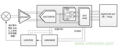 在射頻采樣無線電中,采樣時(shí)鐘的質(zhì)量好壞對(duì)系統(tǒng)產(chǎn)生的信噪比(SNR)具有強(qiáng)烈影響。LMK04828是兼容JESD204B的超低噪音時(shí)鐘抖動(dòng)清除器,可生成小于100fs抖動(dòng)、具有射頻采樣能力的時(shí)鐘,同時(shí)具有一系列收縮或簡(jiǎn)化系統(tǒng)的特性。因支持最多七個(gè)JESD204B裝置,LMK04828可以為多個(gè)ADC32RF45 ADC、數(shù)字模擬轉(zhuǎn)換器(DAC)、FPGA或DSP記時(shí)。LMK04828還可以生成系統(tǒng)參考(SYSREF)信號(hào),用于JESD204B系統(tǒng)中確定性延遲,而數(shù)字和模擬延遲可幫助滿足每個(gè)JESD204B設(shè)備的關(guān)鍵計(jì)時(shí)需求。
