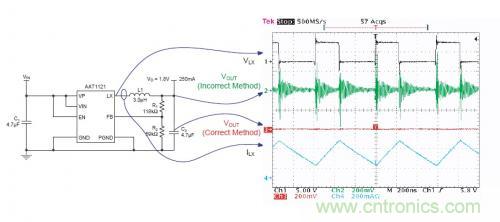 下圖描述了采用兩個不同的測試方法得到的Vout波形。電源電路是一個BUCK轉(zhuǎn)換電路(AAT1121),工作在1.5MHz的開關(guān)頻率,輸出電壓為1.8V/250mA。示波器采用全帶寬測試??梢钥吹桨殡S著PWM開關(guān),在綠色的trace2有一個很高的噪音以及振鈴,但是trace3上卻沒有明顯的噪聲。通過對比可以看到,測試方法的選擇對結(jié)果的準(zhǔn)確性很關(guān)鍵。