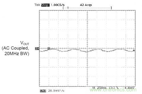 下圖是采用20MHz帶寬限制測試到的電源的紋波以及噪聲。示波器20MHz的帶寬限制是為了防止無源探頭帶入的共模噪聲。可以看到AAT1121BUCK轉(zhuǎn)換器的紋波噪聲為10mVp-p,幾乎看不到開關(guān)噪聲。這主要是歸功于BUCK控制器的低噪聲設(shè)計,良好的PCB設(shè)計,以及恰當(dāng)?shù)臏y試方法。