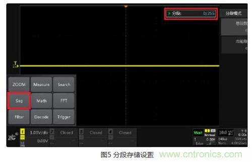 點擊【Seg】,通過調(diào)節(jié)時基檔位,在560Kpts存儲深度的狀態(tài)下,將分成255段進行存儲和采集,如下圖5: