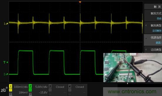 圖3.CH1使用夾子測(cè)量電源輸出,CH2使用夾子測(cè)量電感,單點(diǎn)接地
