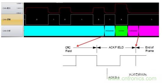 ACK界定符:ACK界定符是ACK場的第二個(gè)位,并且是一個(gè)必須為“隱性”的位。因此,應(yīng)答間隙(ACK SLOT)被兩個(gè)“隱性”的位所包圍,也就是CRC界定符(CRC DELIMITER)和ACK界定符(ACK DELIMITER)。