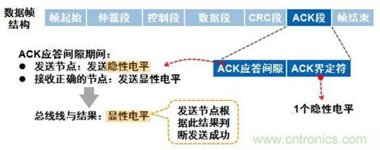 應(yīng)答間隙:所有接收到匹配CRC序列(CRC SEQUENCE)的節(jié)點(diǎn)會在應(yīng)答間隙(ACK SLOT)期間用一“顯性”的位寫入發(fā)送器的“隱性”位來作出回答,由于CAN總線線與的原理,只要總線上有一個(gè)節(jié)點(diǎn)正確接收到數(shù)據(jù),則ACK SLOT就會被填入顯性電平。