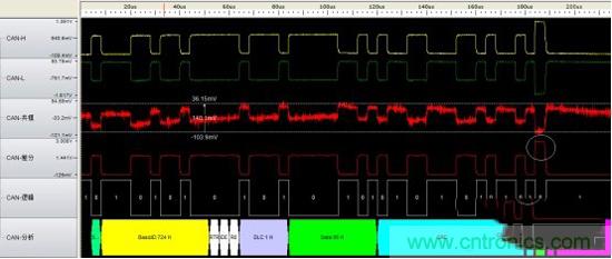 【導(dǎo)讀】CAN總線一直以實(shí)時(shí)性強(qiáng)、傳輸距離遠(yuǎn)、抗干擾能力強(qiáng)、數(shù)據(jù)保證到達(dá)等特點(diǎn)而廣泛應(yīng)用于高可靠性的場合。但常常在觀察CAN通信波形時(shí),我們會發(fā)現(xiàn)差分電平在ACK段突然增高,這是什么原因?qū)е碌哪??這里結(jié)合測試實(shí)例對ACK電平偏高的原因做簡單分析。