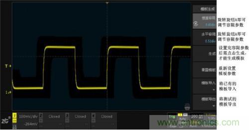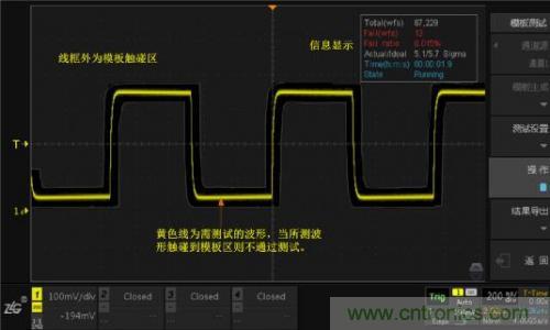 上圖就是模板測試的測試界面,其中,線框外為模板觸碰區(qū),波形接觸到該區(qū)域會被判定為不合格波形,即“Fail”。沒有接觸到模板觸碰區(qū)的波形為“Pass”。右上角顯示信息是模板測試中的一些狀態(tài)信息。