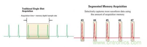 示波器和數(shù)字化儀通常都支持分段存儲(chǔ)器技術(shù)。有了分段存儲(chǔ)器,您可以使用觸發(fā)或選通來選擇性地捕獲波形數(shù)據(jù),從而減少所需的采集存儲(chǔ)器容量。