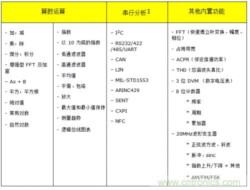 ·測(cè)量和分析。示波器針對(duì)易用性和測(cè)量速度進(jìn)行了優(yōu)化。它們的硬件中內(nèi)置了各種測(cè)量和分析工具。如果是臺(tái)式示波器,用戶可以從臺(tái)式儀器的前面板訪問這些測(cè)量和工具,如果是模塊化儀器,用戶可以從軟件前面板訪問。這使得示波器非常適合用于在設(shè)計(jì)或故障診斷期間進(jìn)行的各種常見測(cè)試。由于測(cè)量在硬件中執(zhí)行,因此可以快速獲取結(jié)果,縮短測(cè)試臺(tái)或 ATE 環(huán)境的測(cè)量時(shí)間。以下所示為 InfiniiVision 系列示波器中提供的一些算數(shù)運(yùn)算、FFT 和串行協(xié)議分析工具。