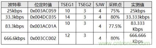 同步跳轉(zhuǎn)寬度(SJW):SJW的值直接影響到重同步時相位緩沖段的可調(diào)節(jié)的范圍,SJW的值可以在1~4之間選擇,我們選擇3、4可以使總線獲得更寬的波特率容忍度;