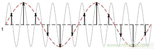 當(dāng)采樣過程不滿足Nyquist(奈奎斯特)采樣定理,就可以考慮使用另一種采集方法--等效采樣。等效采樣的基本原理是把高頻、快速信號變成低頻、慢速重復(fù)信號進(jìn)行采集。為了達(dá)到低速采樣還原高頻信號的目的,要求被測信號一定是周期變化的,如果將每個采樣點安排在不同信號周期內(nèi),取自波形不同的位置上,而不是在同一個周期的話,就可以大大降低采樣頻率。最后通過數(shù)學(xué)方法再將多個周期內(nèi)的采樣點還原到一個周期內(nèi),重構(gòu)被測信號。