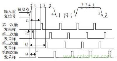等效采樣有可以分為順序等效采樣和隨機等效采樣。順序等效采樣是在間隔K個周期捕獲一個樣值,每經(jīng)過k個周期再經(jīng)過一個微小的延時△t就獲得一個樣值。假設(shè)k=1時,每周期采樣N個點的等效采樣和重構(gòu)過程。最后將采集的數(shù)據(jù)拼湊到一個周期內(nèi),實現(xiàn)對原始輸入信號波形的重構(gòu)。重構(gòu)后的采樣頻率變?yōu)槲⑿⊙訒r△t的倒數(shù)。通過控制這個△t的大小,就可以控制等效采樣的頻率。實際采樣頻率可以通過控制K的大小進(jìn)行調(diào)節(jié)。K越大,實際采樣頻率越??;而△t越小,等效采樣頻率越高。這樣就實現(xiàn)了低速采樣高頻信號的目的。