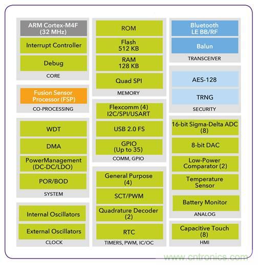圖3,NXP最新推出的支持BLE的無(wú)線MCU QN908x,內(nèi)置優(yōu)化的FSP硬件協(xié)處理器