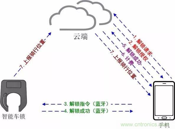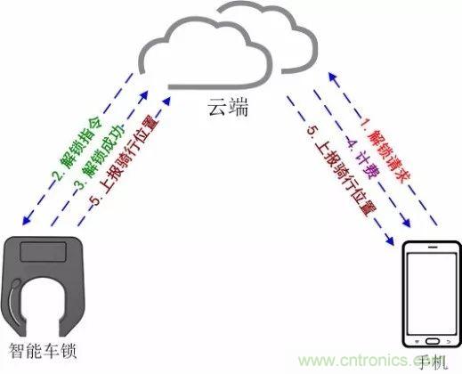 2.云端完成對(duì)用戶和單車的信息核查,并將解鎖指令發(fā)送給單車智能鎖,智能鎖開啟后向云端回復(fù)“解鎖成功”。(備注:部分共享單車在解鎖信息上報(bào)過程中,智能鎖會(huì)把下一次解鎖的密碼或秘鑰也一并上報(bào)給云端)(步驟2、3)