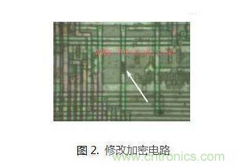 對(duì)不同芯片,提供對(duì)應(yīng)的圖紙,讓廠家做電路修改,目的是讓MCU的存儲(chǔ)區(qū)變得可讀。有些MCU默認(rèn)不允許讀出Flash或者E2PROM中的數(shù)據(jù),因?yàn)橛杏布娐纷霰Wo(hù),而一旦切斷加密連線,程序就暴露可讀了。如圖2所示