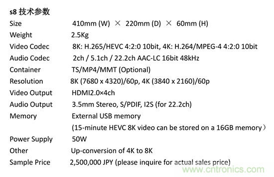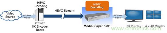 索喜科技通過搭載4枚LSI“MB86M31”組成8K HEVC實(shí)時(shí)編碼系統(tǒng),配合媒體播放器s8,完成8K影像編碼、發(fā)送、解碼、顯示所有必須的影像處理,為8K影像發(fā)送提供整體解決方案。