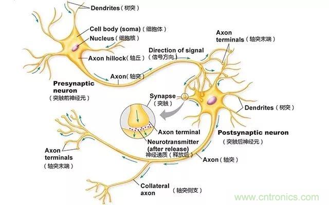 人腦神經(jīng)元在接受到刺激后,其細(xì)胞膜內(nèi)外帶電離子分布將發(fā)生變化,因而形成電位差,電位差將沿著神經(jīng)細(xì)胞軸突、樹突雙向傳導(dǎo),形成脈沖電流。而當(dāng)該電信號(hào)傳遞到突觸時(shí),突觸前神經(jīng)元將釋放神經(jīng)遞質(zhì)(如多巴胺、腎上腺素)由突觸后神經(jīng)元接受神經(jīng)遞質(zhì)產(chǎn)生興奮(該過(guò)程單向傳遞),并向下傳遞作用與人體反應(yīng)器并發(fā)生反應(yīng)。