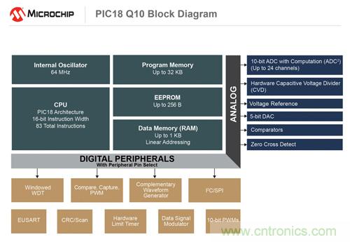工具和遙控器)進(jìn)行了優(yōu)化。 該系列器件不僅集成了高速模數(shù)轉(zhuǎn)換器(ADC),提高模擬信號(hào)轉(zhuǎn)換速度從而產(chǎn)生確定性系統(tǒng)響應(yīng),還提高了振蕩器精度,使設(shè)計(jì)師能夠減少外部元件并節(jié)省成本。 PIC18 Q10系列的CIP包括互補(bǔ)波形發(fā)生器 (CWG)外設(shè),可簡(jiǎn)化復(fù)雜的開(kāi)關(guān)設(shè)計(jì);帶計(jì)算功能的模數(shù)轉(zhuǎn)換器 (ADC2),可在硬件中執(zhí)行高級(jí)計(jì)算和數(shù)據(jù)過(guò)濾,完全無(wú)需內(nèi)核干預(yù)。 此類(lèi)CIP讓CPU能夠執(zhí)行人機(jī)接口 (HMI) 控制等更復(fù)雜的任務(wù),并在無(wú)處理需求時(shí)保持低功能模式,實(shí)現(xiàn)節(jié)能。
