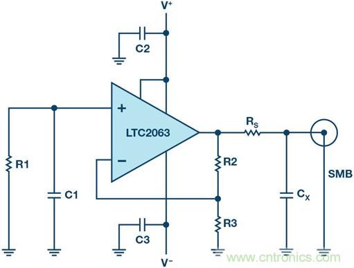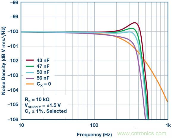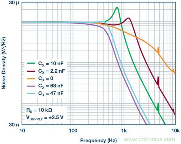 關(guān)鍵IC參數(shù)與運(yùn)算放大器電源電流有關(guān),低電源電流的器件可能需要稍大的CX,而高電源電流的器件很可能需要小于30 nF的電容,同時實(shí)現(xiàn)更寬的平坦帶寬。