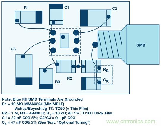 為獲得最佳精度和長期穩(wěn)定性,R2、R3或RS可以是0.1%薄膜電阻,例如TE CPF0603。C2/C3可以是大多數(shù)電介質(zhì)電容中的一種;C0G可用來保證低漏電流。