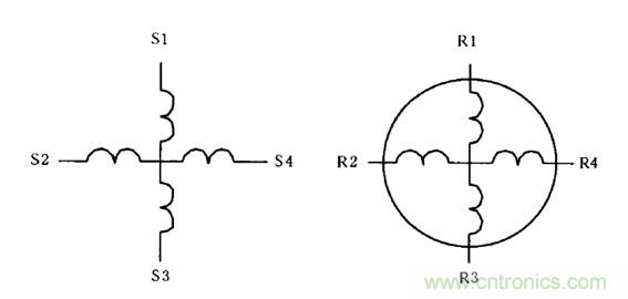 如上圖1所示,S1-S3作為勵磁繞組,S2-S4作為定子交軸繞組,兩者空間互相垂直且匝數(shù)、型式完全相同。R1-R3和R2-R4分別為轉(zhuǎn)子上的正弦輸出繞組和余弦輸出繞組,它們的結(jié)構(gòu)也完全相同。