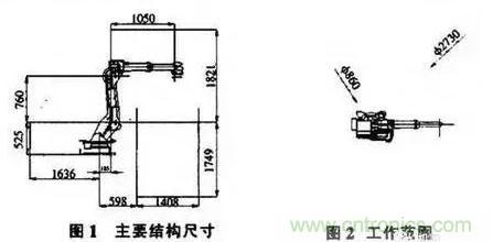 根據A II—V6L型工業(yè)機器人的主要參數進行設計。主要結構尺寸如圖I所示。機器人的工作范圍見圖2。