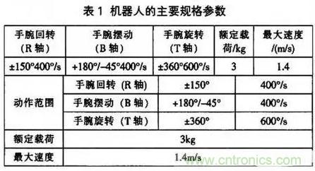 確定了空間結構和手腕結構后,可確定手腕回轉、手腕擺動及手腕旋轉三個姿態(tài)的自由度。其參數見表l (參數來于SSA2000工業(yè)機器人)。