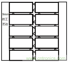 工藝邊用于在自動化貼片時(shí),貼片機(jī)需要夾住板子的邊緣進(jìn)行貼片,通常只需要加兩邊即可。工藝邊寬度的選擇通常比較寬泛,可以選常用的9mm。注意工藝邊只是在貼片生產(chǎn)時(shí)用到,在元件組裝完后就可以掰掉的。開發(fā)人員在畫板子的時(shí)候不需要把工藝邊給畫上去,但是需要在發(fā)給廠家的文件中需要注明。工藝邊如下圖所示:
