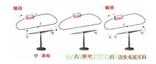 上圖展示了電流的磁效應,導線通電之后,周圍產生的磁場使磁針發(fā)生了偏轉。