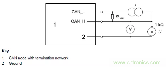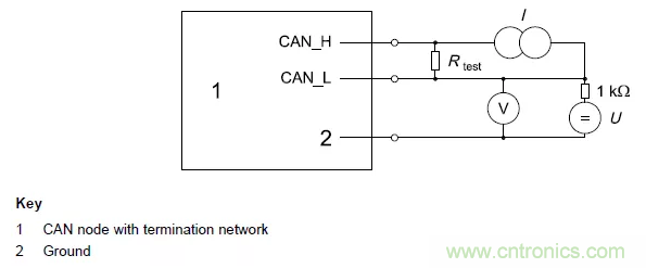 一個(gè)CAN節(jié)點(diǎn)集成電路協(xié)議設(shè)置為總線空閑時(shí),可檢測(cè)到的隱性位輸入限值應(yīng)通過圖 1的電路測(cè)量。其中I的值是指可以產(chǎn)生使節(jié)點(diǎn)在隱性狀態(tài)下檢測(cè)到隱性位的最大差分輸入電壓的電流值。電壓源U的電壓為: