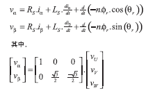 最新無(wú)傳感器算法基于如圖1所示的永磁同步電機(jī)的簡(jiǎn)化模型,電機(jī)繞組反電勢(shì)波形為轉(zhuǎn)子角度的正弦函數(shù),因而能夠用于測(cè)量轉(zhuǎn)子角度。通過(guò)測(cè)量外加定子電壓時(shí)流入定子線圈的電流可以計(jì)算反電勢(shì)。為簡(jiǎn)化數(shù)學(xué)運(yùn)算,可以利用 Clarke變換將三相電路變換為兩相等效模型,這樣就可以用轉(zhuǎn)子角度的正弦和余弦函數(shù)表示反電勢(shì),其等效電路可以由以下方程描述: