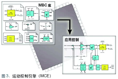 無(wú)傳感器磁場(chǎng)定向控制算法能夠以全新的控制器體系結(jié)構(gòu)實(shí)現(xiàn)。圖2中所示控制系統(tǒng)的每個(gè)功能都可以用硬件宏模塊實(shí)現(xiàn),而不是軟件。諸如比例積分控制、矢量旋轉(zhuǎn)和Clarke變換等功能可共用于所有交流電機(jī)控制系統(tǒng)。如圖3所示,運(yùn)動(dòng)控制引擎(Motion Control Engine)庫(kù)中包含交流電機(jī)控制模塊和其它通用模塊。獲取電機(jī)控制芯片,就能夠取得MCE庫(kù),以及模擬輸入和空間矢量PWM控制等功能。開發(fā)人員可以使用圖形工具將元件從MCE庫(kù)拖入自己的控制系統(tǒng)設(shè)計(jì),然后利用圖形編譯器將控制設(shè)計(jì)翻譯為MCE序列指令,以正確順序連接硬件宏模塊從而實(shí)現(xiàn)自己的控制系統(tǒng)。該方法可以不必在開發(fā)過(guò)程中進(jìn)行軟件編碼,既能節(jié)省時(shí)間,又能減少錯(cuò)誤。