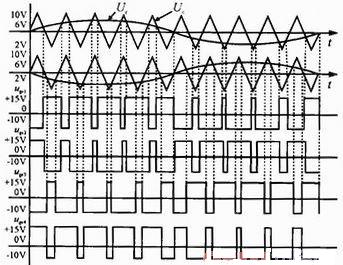 本文采用調(diào)制法產(chǎn)生PWM波形,采用等腰三角波作為載波,因為等腰三角波上任一點的水平寬度和高度成線性關系且左右對稱,當它與任何一個平緩變化的調(diào)制信號波相交時,如果在交點時刻對電路中開關器件的通斷進行控制,就可以得到正比于信號波幅值的脈沖,這正好符合PWM控制的要求。