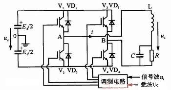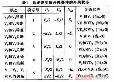 在采用IGBT作為開關器件的單相橋式PWM逆變電路中,假設負載為阻感負載。工作時V1和V2的通斷狀態(tài)互補,V3和V4的通斷狀態(tài)也互補。逆變橋的主回路由左右橋臂組成,每個橋臂有兩個IGBT,每一個開關器件都有一個PWM波控制其導通,且同一橋臂上的兩功率開關器件不能同時導通,否則會導致直流電壓短路??紤]到在感性負載下二極管VD1、VD2、VD3、VD4存在著續(xù)流的現(xiàn)象,且逆變橋同一橋臂上的兩個IGBT不能同時導通,所以在逆變電路中存在著五種開關狀態(tài),具體情況如表1所示。單相橋式刪逆變電路如圖1所示。