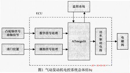 傳感器所產(chǎn)生的信號分兩種:一種是數(shù)字信號,如曲軸/凸輪軸信號,經(jīng)數(shù)字信號處理電路,進行濾波、放大和整形,轉(zhuǎn)換成標準的方波信號,分別輸入到ATmega16的輸入捕捉(ICP1)引腳和外部中斷1(INT1)引腳。另一種是模擬信號,如油門位置信號,經(jīng)模擬信號處理電路進行濾波后,輸入到ATmega16的AD轉(zhuǎn)換輸入通道0(ADC0)引腳。