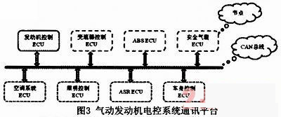 氣動發(fā)動機的控制系統(tǒng)是極其復雜的,不僅包括轉(zhuǎn)速、油門位置等信號的采集處理;還要對電磁閥的噴氣定時和噴氣量完成精確控制等等。另外,氣動汽車上還包括ABS、空調(diào)系統(tǒng)和車輛燈光等模塊,這些模塊需要實時共享車輛的數(shù)據(jù),以達到整車的最優(yōu)控制。傳統(tǒng)的電氣控制設計策略已經(jīng)不能滿足當今電氣控制網(wǎng)絡的需要,而CAN總線的數(shù)據(jù)通訊具有突出的可靠性、實用性和靈活性等特點。氣動發(fā)動機電控系統(tǒng)通訊平臺如圖3所示。它具有布線成本低、通訊速率高和數(shù)據(jù)傳輸精度高等優(yōu)勢。