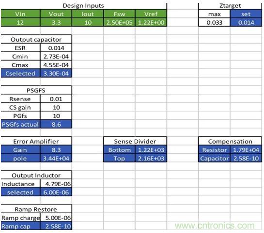 最小電容和最大電容限值也是計(jì)算出來(lái)的,而最終入選值還可供選擇,選定值再用于剩下的計(jì)算。這些覆蓋值也允許其它輸入,包括PGFS和輸出電感。重要的是,這些決定和選擇要按此順序進(jìn)行。