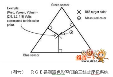 基本上來說,三色光感測(cè)器會(huì)產(chǎn)生一個(gè)三維色彩規(guī)格系統(tǒng),因此稱為RGB感測(cè)器色彩空間,這個(gè)系統(tǒng)可以讓特定色彩由感測(cè)器的輸出電壓來指定,例如具備特定亮度的D65白光可以記錄為:(Vred,?。郑纾颍澹澹?, Vblue)=(2.0,?。玻?,?。保梗觯铮欤簦?。
