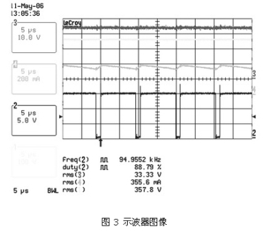 圖 2 、圖3 及表 2、表3 顯示了這種電路在90 ~265 VAC的通用輸入電壓范圍內(nèi),以350 mA驅(qū)動兩個有6個串聯(lián)LUXEON FLOOD 25-0032 HB-LED板時的結果。表 2 顯示了在輸入電壓范圍內(nèi)良好的電流調(diào)節(jié)。圖 2 和圖3 說明了正如理論所示的,由于占空比較小,輸入電壓較高時紋波較差。這表明在主電壓較低的地區(qū),如北美和日本,設備性能更加良好。然而,即使在最差的條件下,只要控制器輸入電壓保持在90 ~265 VAC的范圍內(nèi),仍可對電流進行適時調(diào)節(jié)。同時對只使用6個HB-LED板的系統(tǒng)進行了測量(見表 3) ,對比結果發(fā)現(xiàn),±1.3%的調(diào)節(jié)差距導致負載電壓的差距高達33.4V ~16.4V。