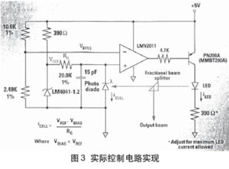 圖2示出采用運放的電路,用于分析控制環(huán)路。此電路驅(qū)動1個PNP晶體管,此晶體管為產(chǎn)生光發(fā)射的LED提供電流。光發(fā)射照射到光電二極管,光電二極管把光發(fā)射轉(zhuǎn)換為非常小的電流(通常為10mA)。在這種情況下,二極管用在反向模式,所以在無光呈現(xiàn)時,電流為零,但是光電二極管和放大器中的漏電流(也稱之為“暗電流”)是過載。此條件牽引由晶體管基極電阻所限制的電流,開始時晶體管處于飽和狀態(tài)。一旦電流開始流經(jīng)晶體管,則LED或激光二極管將開始發(fā)射光。光電二極管把此部分光轉(zhuǎn)換為電流,流經(jīng)RG。隨著電壓趨于VBIAS(在圖2中為地),環(huán)路將閉合并保持驅(qū)動晶體管的電流來維持LED中的電流以保持恒定光強度(或光電二極管中的電流)。此構(gòu)成電路DC分析的基礎(chǔ)。圖3為用NS公司LMV2011精密運放實際實現(xiàn)電路。用NS的LM4041-1.2并聯(lián)基準(zhǔn)產(chǎn)生基準(zhǔn)電壓,提供固定的1.225V基準(zhǔn)電壓。設(shè)置基準(zhǔn)中的電流在10mA左右,這是工作電流的中間值。由兩個1%精度電阻器產(chǎn)生VBIAS,其值設(shè)置在1V左右。為了計算閉合控制環(huán)路中的光電二極管電流,VREF和VBIAS之差除RG。注意,為了此電路工作,VBIAS必須小于VREF。對于10mA光電二極管電流,RG為0.2×10E-6或 20.0KΩ。4.7KΩ電阻器限制PN200A PNP晶體管基極電流,設(shè)置在1mA左右。晶體管b值為100左右,所以晶體管可提供的最大電流為100mA左右,這超過了微型SOT-23封裝的熱耗。為了避免晶體管的熱擊穿,用與LED或激光二極管串聯(lián)的電阻器限制晶體管集電極電流。若需要更大電流,則具有較大集電極電流的晶體管應(yīng)該用較大的封裝(如SOT-223)。為限制電路帶寬以保持穩(wěn)定性,用與光電二極管并聯(lián)的15pF電容器使放大器滾降頻率在250KHz左右。