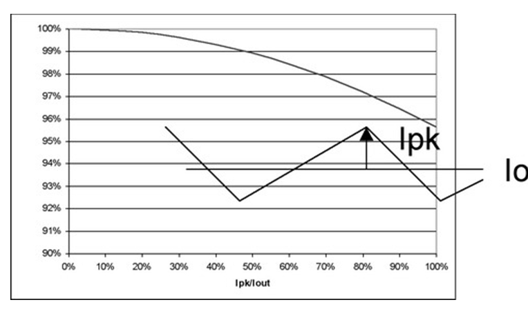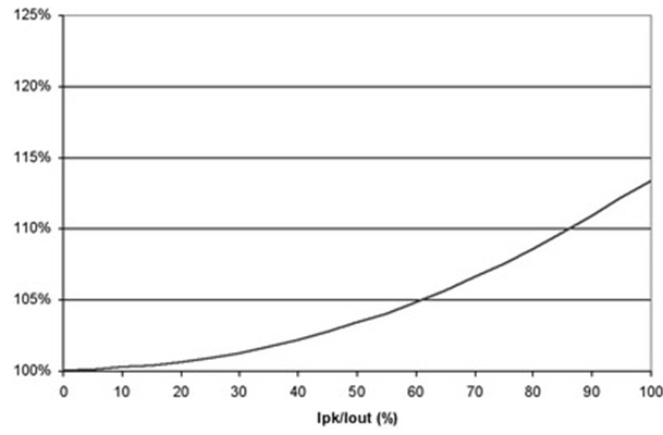 圖4 也闡明了即使在紋波電流較大的時(shí)候,對(duì)功耗也沒有重大影響。例如,50%的紋波電流僅增加不足5%的功率損耗。當(dāng)大大超過此水平時(shí),需要減小電源的DC電流以保持結(jié)溫不變,從而維持半導(dǎo)體的使用壽命。經(jīng)驗(yàn)法則顯示,結(jié)溫每降低10%,半導(dǎo)體使用壽命就會(huì)延長兩倍。并且,許多設(shè)計(jì)都傾向于更小的紋波電流,這是因?yàn)殡姼衅鞯南拗?。絕大多數(shù)電感的設(shè)計(jì)處理能力小于20%的Ipk/Iout紋波電流比率。