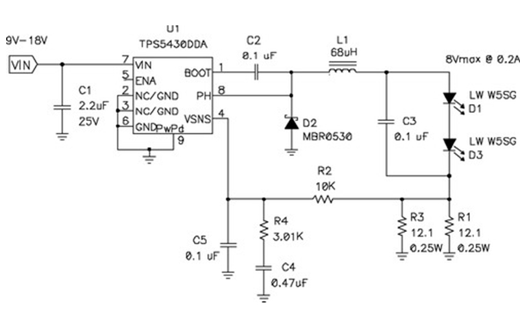 在輸出電壓始終小于輸入電壓的情況下,應(yīng)使用降壓穩(wěn)壓器,圖5顯示了該拓?fù)浣Y(jié)構(gòu)。在該電路中,對(duì)電源開關(guān)的占空比 (duty factor) 進(jìn)行了控制,以在輸出濾波器電感 L1 上確立平均電壓。當(dāng)FET開關(guān)閉合時(shí)(TPS5430 內(nèi)部),其將輸入電壓連接到電感器,并在L1中構(gòu)建電流。D2為環(huán)流二極管 (catch diode),可提供開關(guān)斷開時(shí)的電流路徑。電感器可對(duì)流過LED的電流起到平滑的作用,該工作可通過用電阻監(jiān)控(測量)LED電流,并將電壓與控制芯片內(nèi)部的參考電壓進(jìn)行比較,最終進(jìn)行調(diào)節(jié)。如果電流太低,則占空比增加,平均電壓也上升,從而也導(dǎo)致了電流的升高。該電路具有極佳的效率,因?yàn)殡娫撮_關(guān)、環(huán)流二極管以及電流感測電阻上的壓降非常低。