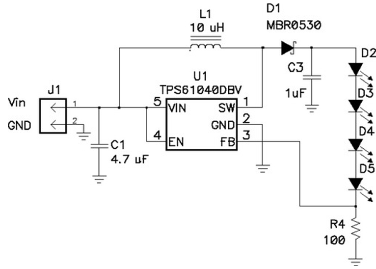 當(dāng)輸出電壓總是比輸入電壓大時(shí),最好采用升壓轉(zhuǎn)換電路,如圖6所示。該電路的U1有一個(gè)帶有控制電子器件的高度集成的電源開關(guān)。當(dāng)開關(guān)閉合時(shí),電流流過電感器到接地。當(dāng)開關(guān)斷開時(shí),U1的引腳 1 電壓會(huì)升高,直到D1導(dǎo)通。然后電感器放電,電流進(jìn)入輸出電容器(C3)和LED串。在絕大多數(shù)應(yīng)用中,C3通常用于平滑LED電流。如果沒有C3,則 LED電流將是斷斷續(xù)續(xù)的。也就是說,它會(huì)在零和電感電流之間切換,這會(huì)導(dǎo)致 LED 熱量增加(從而縮短使用壽命),亮度減少。在前面的例子中,LED 的電流是通過一個(gè)電阻感測的,并且占空比會(huì)發(fā)生相應(yīng)的變化。請(qǐng)注意,本拓?fù)浯嬖谝粋€(gè)嚴(yán)重的問題,即它沒有短路保護(hù)電路。若輸出短路,則會(huì)有較大的電流通過電感器和二極管,從而導(dǎo)致電路失效,或者輸入電壓崩潰。