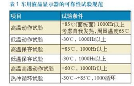 車用液晶顯示器最基本的要求特性就是耐環(huán)境性,表1是車用液晶顯示器的可靠性試驗(yàn)規(guī)范。隨著汽車廠商的不同,要求條件更嚴(yán)苛的耐環(huán)境試驗(yàn),例如高溫+ 95℃、低溫-40℃,高溫高濕65℃、濕度90%,試驗(yàn)時(shí)間2000小時(shí)等特性,面臨這種情況,業(yè)者利用隨機(jī)抽樣樣品進(jìn)行試驗(yàn),確認(rèn)使用上完全符合耐環(huán)境試驗(yàn)要求的特性。
